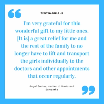 In October 2020, Muriel's Angels, with support from Aero Mobility gifted a customized wheelchair-accessible van for the Santos Family. Both Maria and Samantha Santos suffer from Muscular Dystrophy, confining them to their wheelchairs. The Santos' new mobility van is customized to accommodate both wheelchairs being able to travel together in comfort and with room left for the whole family. Aero Mobility is honored to partner with Muriel's Angel in seeing this family back on the road.