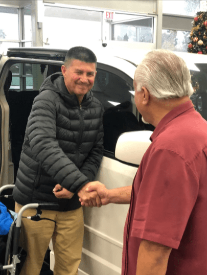 Dale Hight, General Manager of Aero Mobility, hands David Ali the keys to his brand new wheelchair-accessible Dodge.