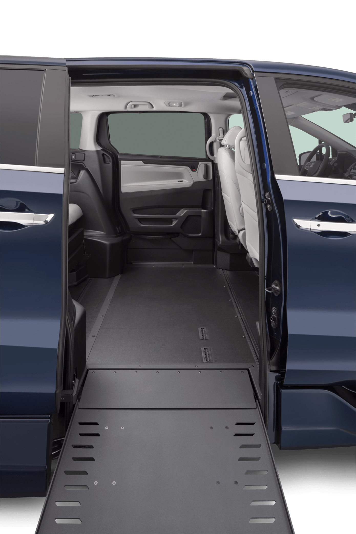 Available in passenger side entry with either a power foldout or in-floor 30" ramp system. Built with details in mind, the accessible Honda Odyssey is equipped with a keyless remote, a backup camera, and durable floors for quick clean-up while reducing friction on chair wheels. Driver and passenger side step flares ensure easy access for rider assistance. The rear bench seat comes with a foldout footrest for maximum passenger comfort.